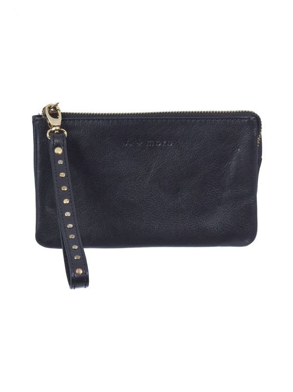 Näppärän kokoisessa nahkalaukussa on irrotettava niittisomisteinen rannelenkki, josta laukkua voi kantaa. Sisäpuolella on kaksi tekstiilivuorattua osiota, joista toisessa on avotasku ja neljä korttilokeroa ja toisessa vetoketjutasku. Myös laukun ulkosivulla on vetoketjutasku.