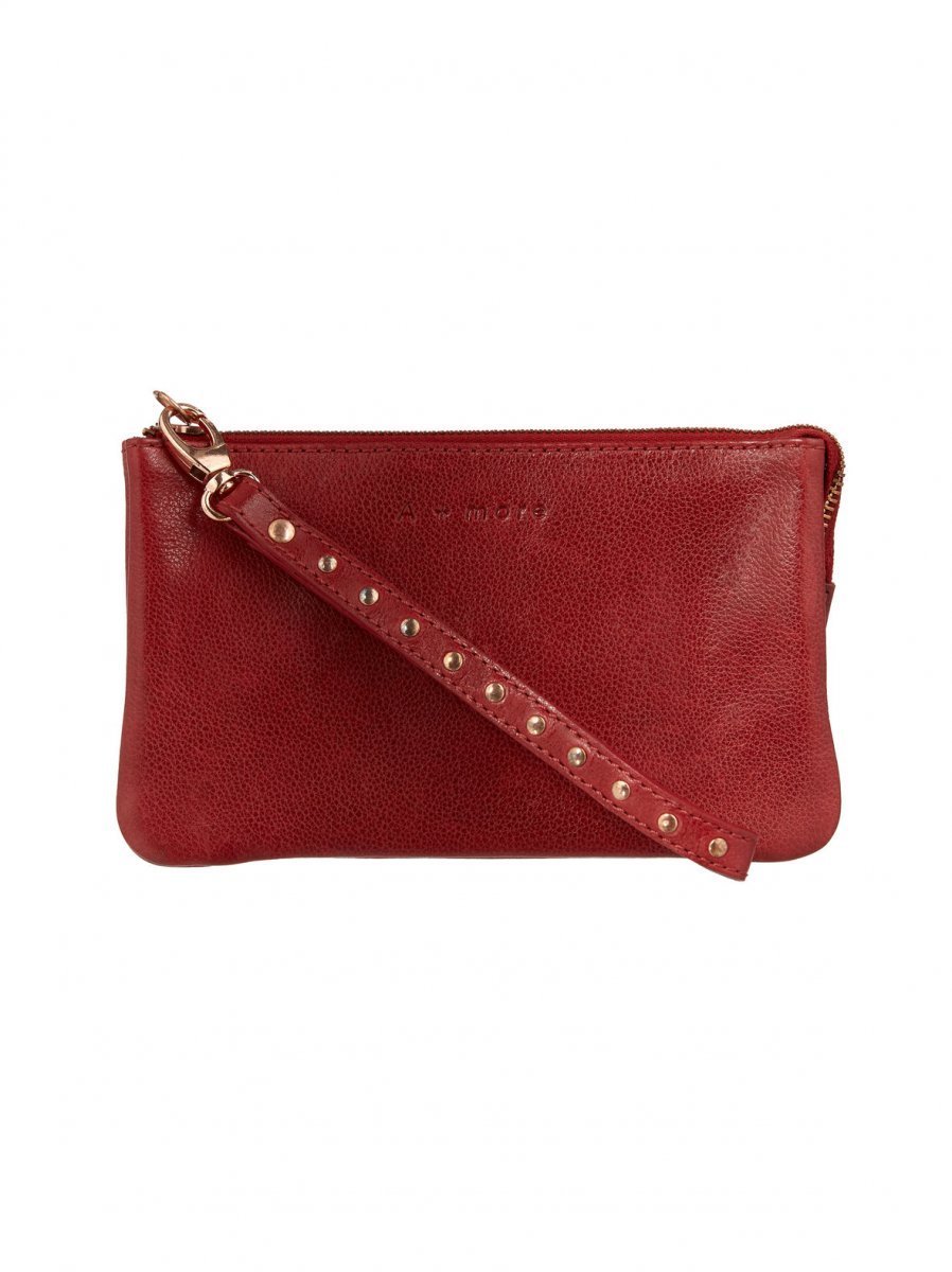 Näppärän kokoisessa nahkalaukussa on irrotettava niittisomisteinen rannelenkki, josta laukkua voi kantaa. Sisäpuolella on kaksi tekstiilivuorattua osiota, joista toisessa on avotasku ja neljä korttilokeroa ja toisessa vetoketjutasku. Myös laukun ulkosivulla on vetoketjutasku.