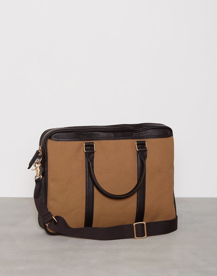 Baron tietokonelaukku- Valmistettu kanvaksessta ja yksityiskohdat nahkasta. SIsäpuoli tekstiiliä.- Suljetaan vetoketjulla- Kaksi ulkolokeroa neppari-kiinnityksellä- Kaksi kantokahvaa ja mukaan kuuluva olkaremmi joka kiinnitetään lyhytsivuille- ISompi sisälokero nepparilla sekä kahdella pienemmällä lokerolla- Leimattu logo sisäpuolella- Metallinapit alapuolellla-40x30x10 cm- Mukana pölypussi Lataa lehdistökuva Tuotenro: 914524-0243