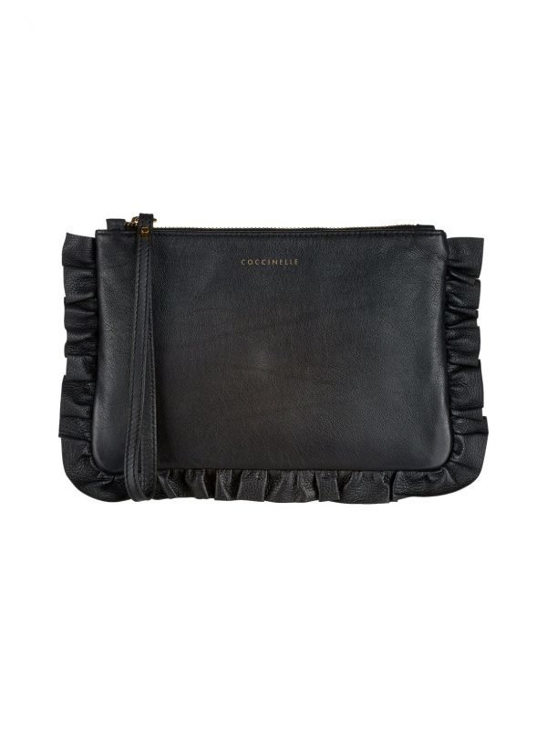 Coccinellen kirjekuorilaukun reunoja koristaa somat röyhelöt. Ohuen laukun vetoketjuun on kiinnitetty rannelenkki. Laukku suljetaan vetoketjulla.