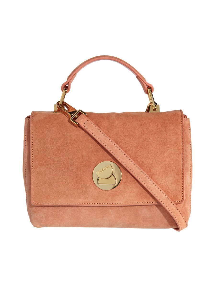 Coccinellen kauniissa Liya Suede Mini Satchel -nahkalaukussa on ihanan pehmeä mokkanahkapinta. Lyhyen kantohihnan lisäksi laukussa on säädettävä olkahihna, jonka voi tarvittaessa irrottaa. Taustapuolella on avoin tasku ja sisäpuolella vetoketjutasku. Laukku suljetaan tyylikkäällä kääntölukolla.