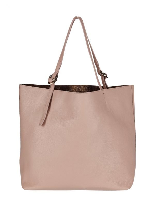 Reilunkokoisessa shopperissa on metallirenkailla somistetut kantokahvat sekä metallinhohtoinen sisäpuoli. Etupuolella on kiiltävä logoteksti. Materiaali on pehmeää nahkaa.