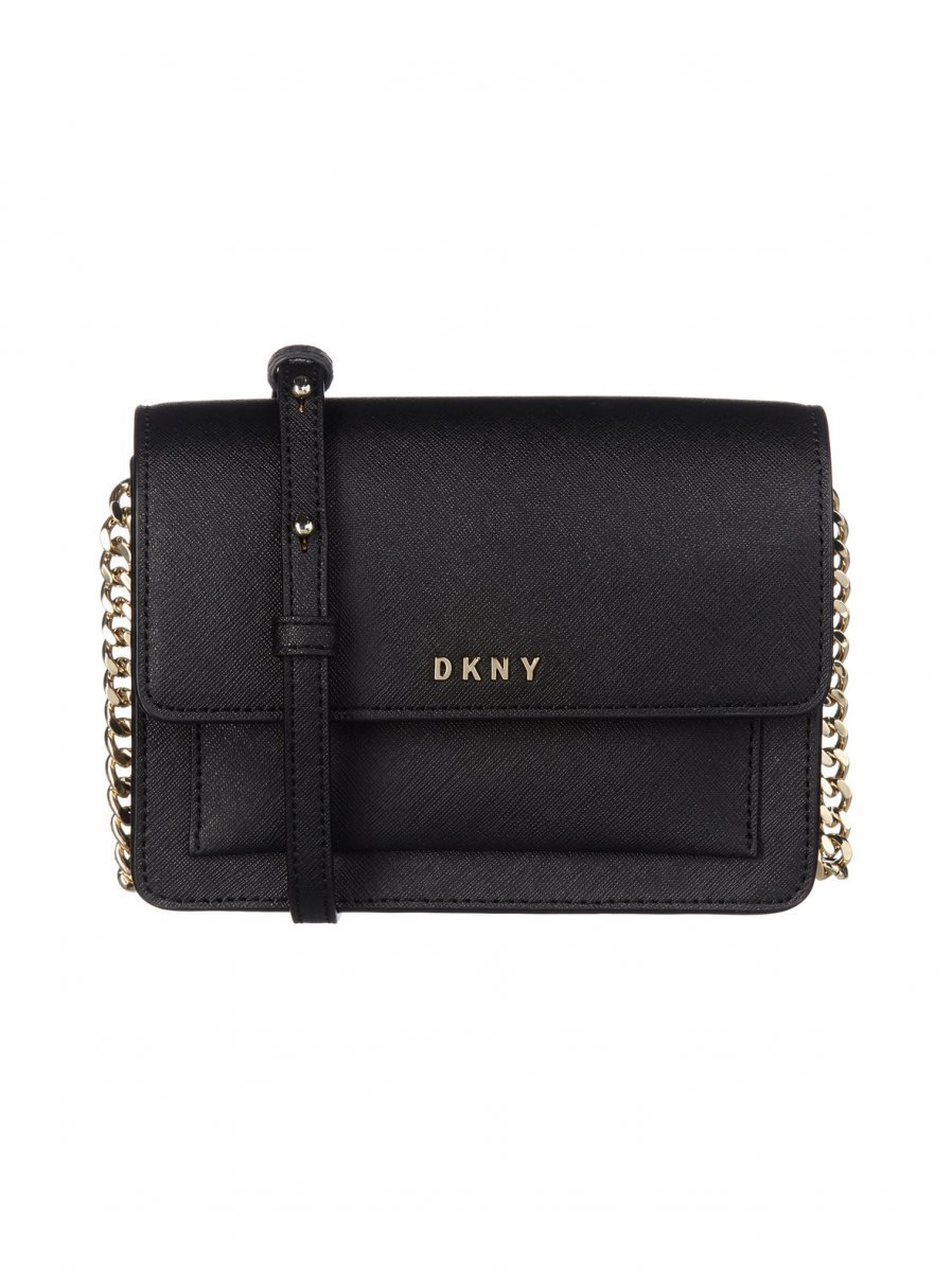 DKNY Bryant Park -sarjan viehättävässä pikkulaukussa on osin ketjusomisteinen olkahihna, jota voi käyttää joko yli olan tai kaksinkertaisena olalla. Saffianonahkaisen laukun molemmilla sivuilla on avoimet taskut ja sisäpuolella pieni sivutasku. Laukku suljetaan magneettinapillisella läpällä.