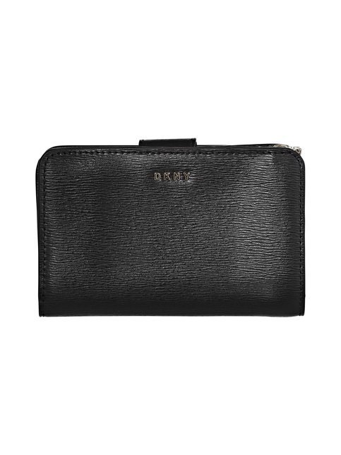 Donna Karanin kompaktissa lompakossa on eläväinen nahkapinta ja somisteena metalliset logokirjaimet. Painonapilla suljettavassa osiossa on 10 korttitaskua, neljä hieman isompaa taskua sekä yksi setelitasku. Vetoketjulla suljettava osio pitää sisällään kaksi kolikkotaskua.