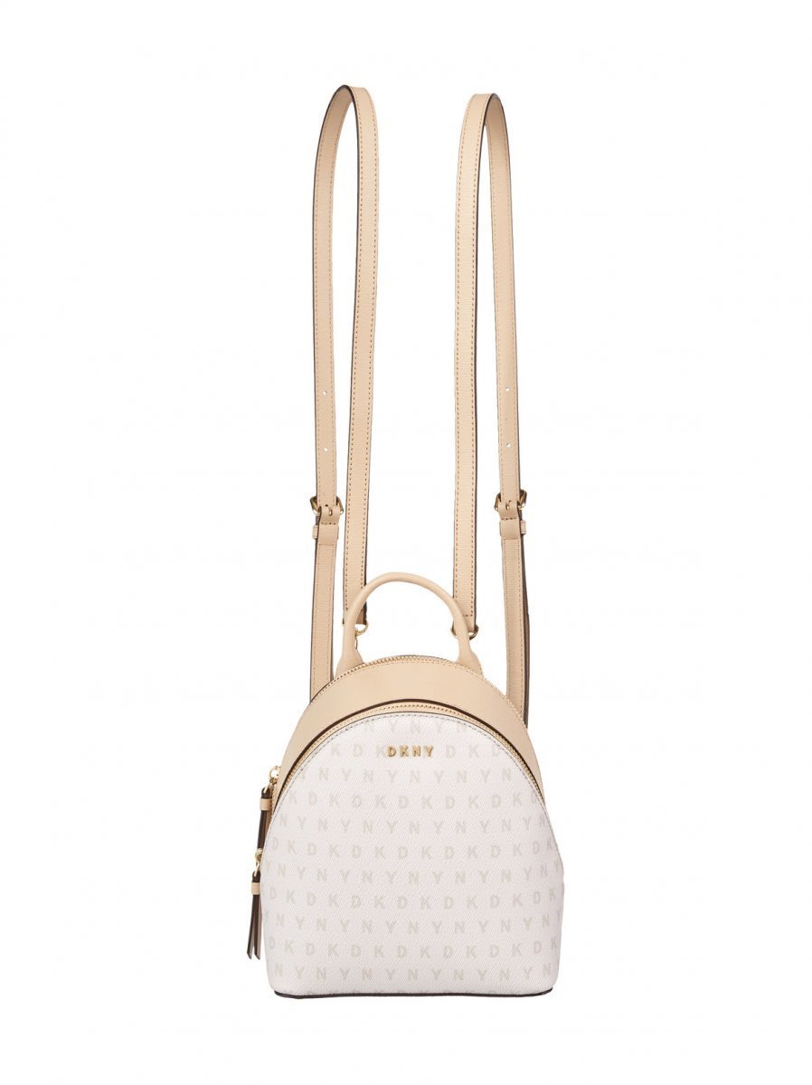 Logokuvioitua DKNY -reppua somistaa riippuva logomerkki ja metallinen logoteksti kohokirjaimin. Repussa on kaksi päätaskua, joista toisen sisäpuolella on kaksi avotaskua ja toisen sisällä vetoketjutasku. Siroja olkaimia voi säätää. Pohjassa on nastat.