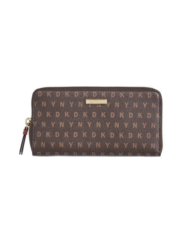 Logokuvioitu DKNY-lompakko suljetaan pitkällä vetoketjulla. Sisäpuolella on erillinen, vetoketjulla suljettava tasku sekä runsaasti tilaa korteille, rahoille ja kuiteille. Lompakon taustapuolella on käytännöllinen avotasku.