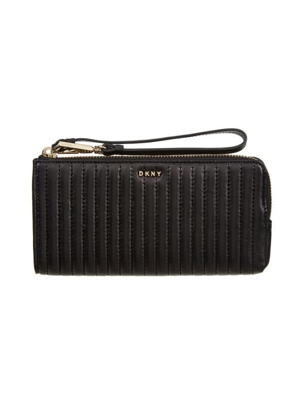 DKNY:n Gansevoort -lompakossa on tikkauksin raidoitettu nahkapinta ja metalliset yksityiskohdat. Rannelenkillä varustettu lompakko toimii tarvittaessa myös pienenä clutch-laukkuna. Kompakti lompakko suljetaan vetoketjulla. Sisäpuolella on kuusi korttitaskua ja useita avoimia taskuja.