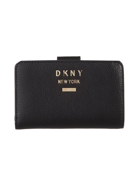 DKNY:n nahkalompakossa on kaunis pinta ja metalliset logosomisteet. Lompakossa on kymmenen korttipaikkaa, vetoketjullinen kolikkolokero ja hyvin tilaa seteleille ja kuiteille. Lompakko suljetaan painonapilla.