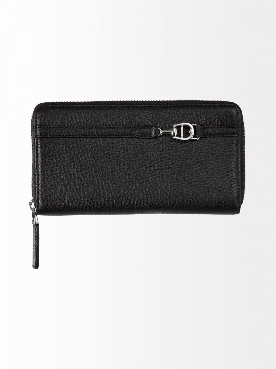 Ajattoman tyylikkäässä eläväpintaisessa lompakossa on metallisomiste ja reunoja kiertävä vetoketjukiinnitys. Sisäpuolella on runsaasti korttitaskuja, avotaskuja ja vetoketjulla suljettava kolikkotasku. Taskut on vuorattu kuviollisella kankaalla. Materiaali on nahkaa. Mitat ovat 18 x 10 cm.
