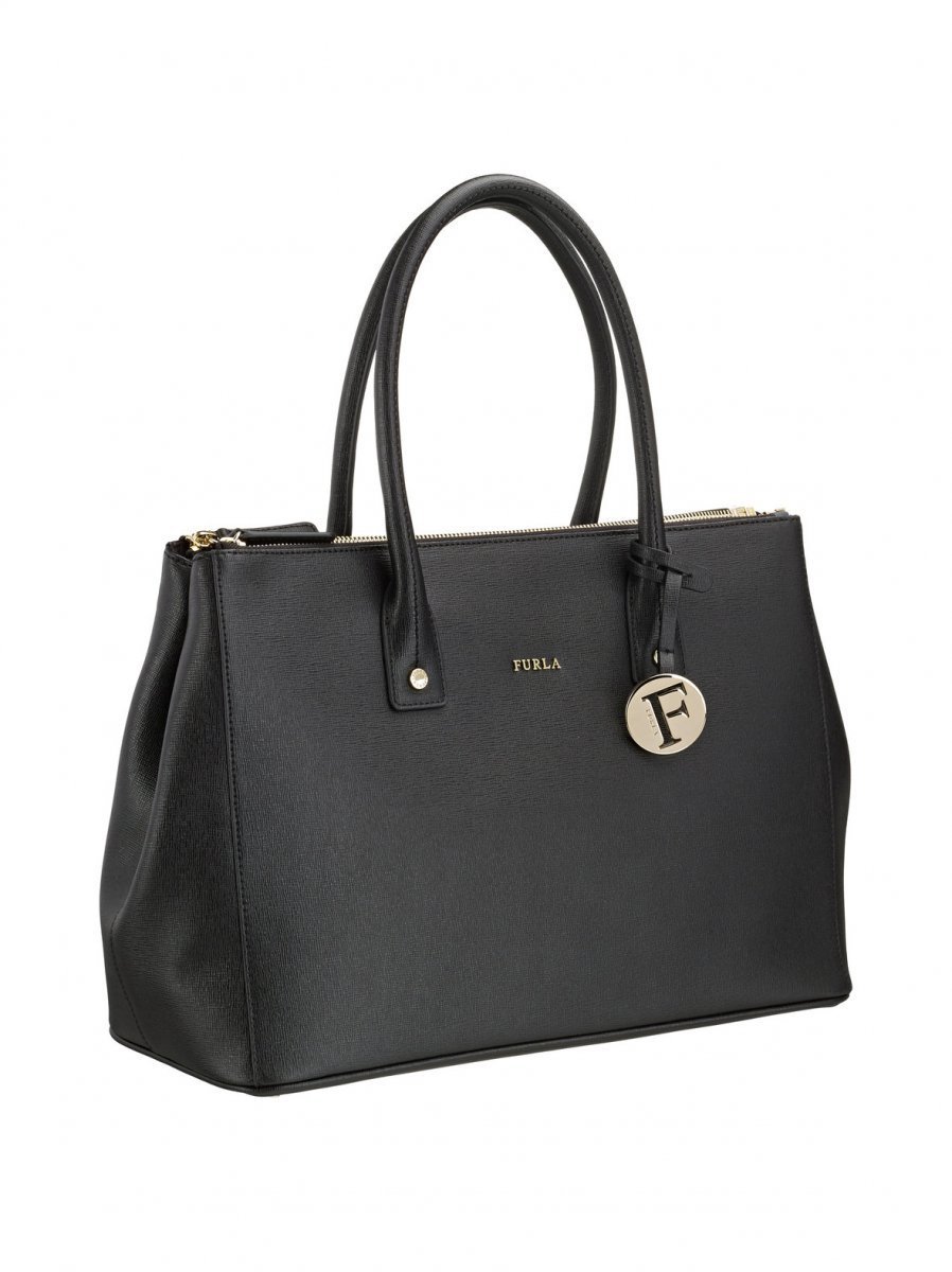 Saffiano-nahkaisessa laukussa on eläväinen pinta ja logoteksti somisteena. Laukussa on pyöristetyt kantokahvat ja irrotettava, metallinen logosomiste. Laukku koostuu kolmesta osiosta, joista reunimmaiset ovat vetoketjukiinnitteisiä ja keskiosio suljetaan magneettinapilla. Keskiosiossa on kaksi vetoketjutaskua ja kaksi avolokeroa. Sivuilla on painonapit, joilla laukun kokoa voi hieman säätää.782713