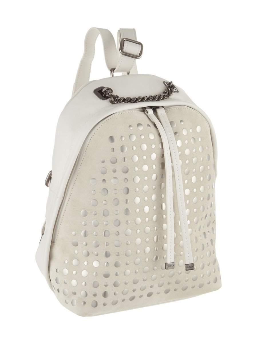 Vaaleassa nahkarepussa on pitkälle sivuille avautuva kaksisuuntainen vetoketju. Vetoketjuja somistaa metallipäiset nahkaliuskat, joista vetoketjut on helppo avata. Repun etupuoleli on koristeltu kauniisti kiiltävillä metallisilla ympyräniiteillä. Repun päällä oleva metalliketjusta tehty kantolenkki on kiinnostava yksityiskohta. Repun nahkahihnaiset olkaimet on säädettävissä. Sisällä repussa on tumma kangasvuori, kaksi avointa taskua sekä vetoketjutasku. Repun pohja on vehvenettu, joten se pysyy kaniisti muodossaan. Repun materiaali on nahkaa ja metallia, vuori on 78 % viskoosia ja 22 % polyamidia.