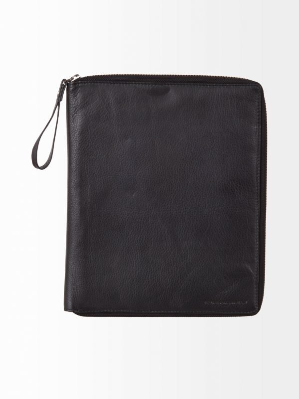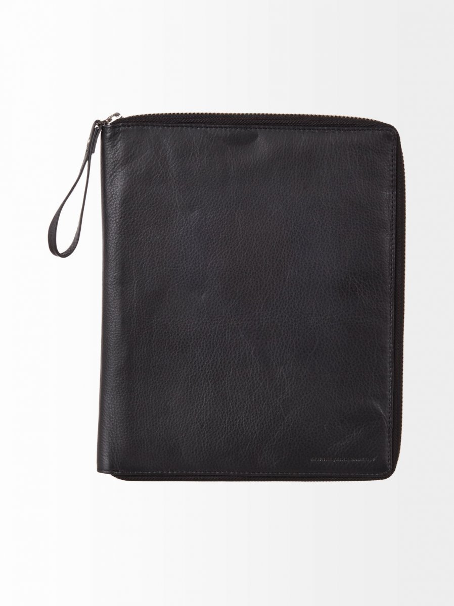 Nahkaisessa iPad-suojakotelossa on vetoketjukiinnitys ja sisäpuolella on avotaskuja ja taskuja korteille. Mitat ovat 25 x 21 cm.