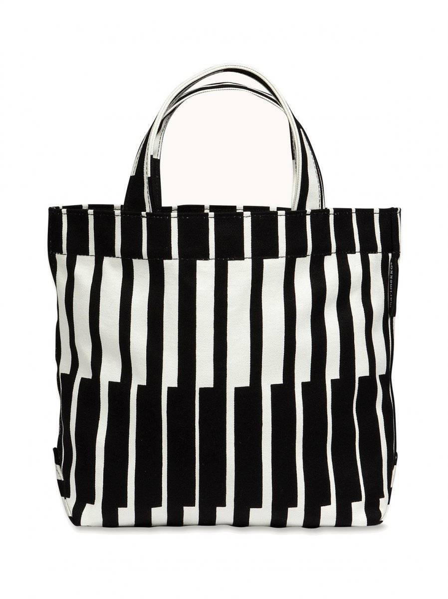 Kestävästä puuvillamarkiisista valmistettua käsilaukkua koristaa Pentti Rinnan mustavalkoinen Pieni Taite -kuosi. Laukussa on magneetilla suljettava läppä ja sisäpuolella vetoketjullinen tasku.