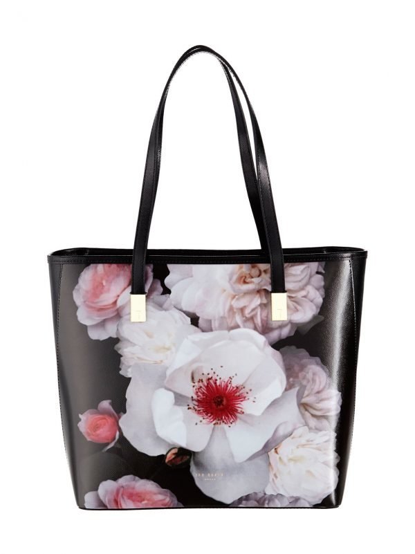 Ted Baker Londonin ryhdikkäässä shopper-mallisessa Laylaah-laukussa on tiheästi teksturoitu, kevytkiiltoinen nahkapinta sekä etusivulla valokuvamaisen tarkka kukka-aihe. Vetoketjulla sulkeutuva sisäpuoli on yhtenäistä avaraa tilaa. Upeasti kullansävyisin kiinnikkein viimeistellyt kantokahvat ovat tarpeeksi pitkät olalle.