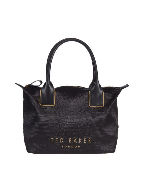 Ted Baker Londonin Zetaa Excotic Detail Small Tote Bag -laukussa on upeasti matelijakuvioitu, kevyesti hohtava satiinikangaspinta, pyöreät keinonahkakahvat sekä kullansävyiset metalliyksityiskohdat. Vetoketjulla sulkeutuvan laukun tilava sisäpuoli on täysin yhtenäinen ja kantokahvat ovat sopivat yltämään olalle. Kullansävyinen Ted Baker London -metallilogo viimeistelee kokonaisuuden